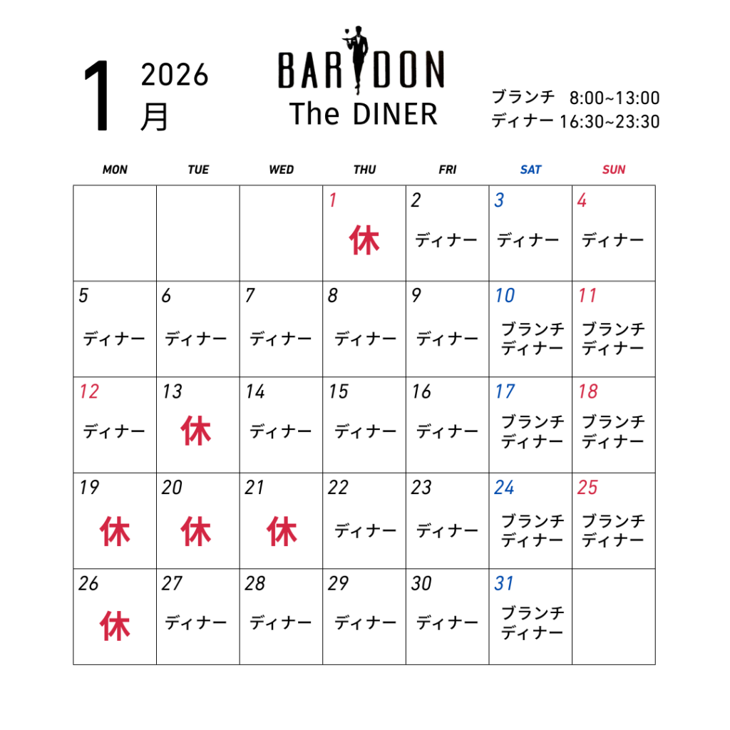また、2026年からは1月10日(土)より、土日限定でブランチも行うことに決定いたしました!!8:00〜13:00までのブランチタイムと16:30〜23:30までのディナータイムで営業いたします。